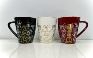 一方、白のマグカップには、クリスマスマーケットの飾り付けが完成し、華やかに賑わう会場を遠くから見つめるサンタクロースの夜の情景が表現されています。